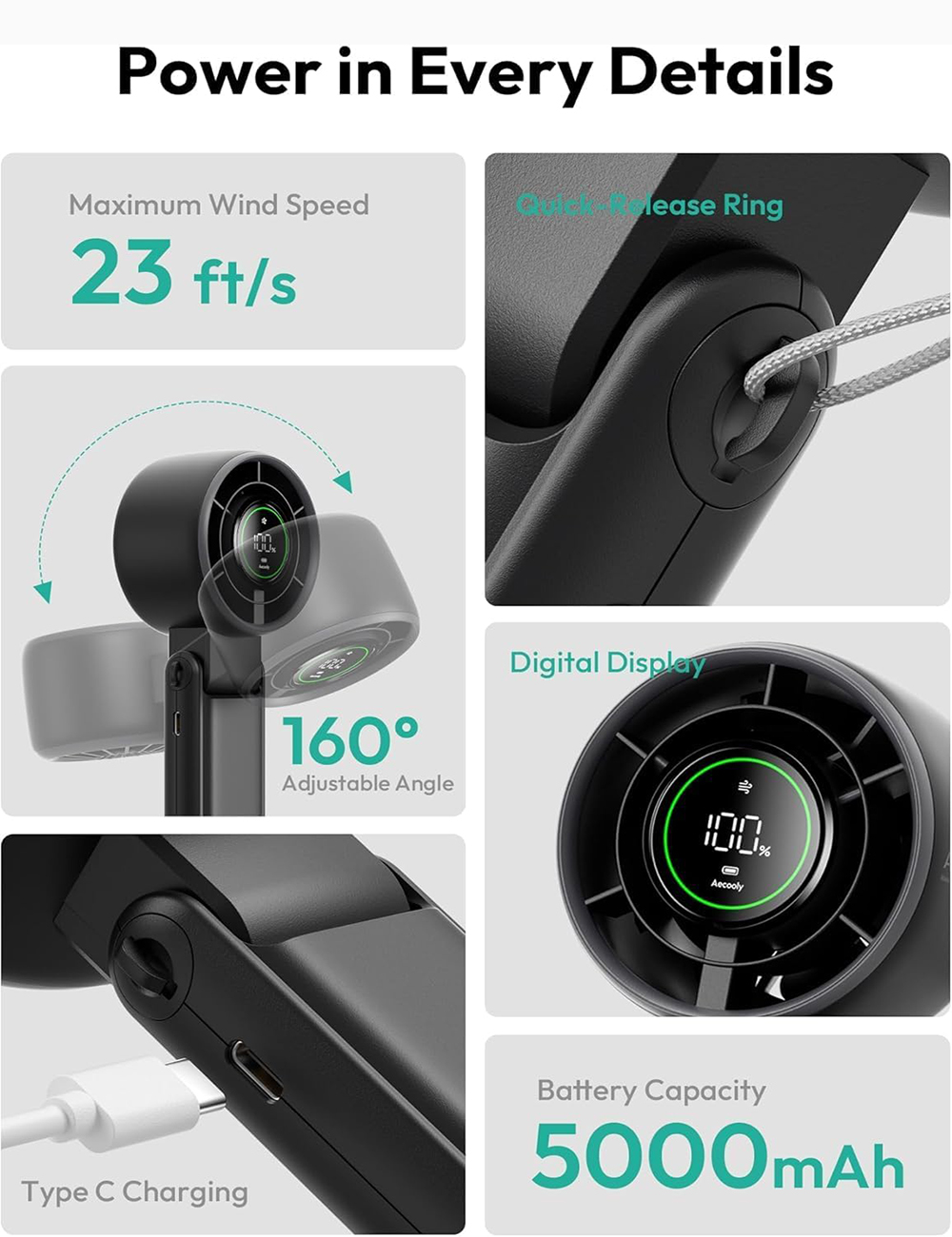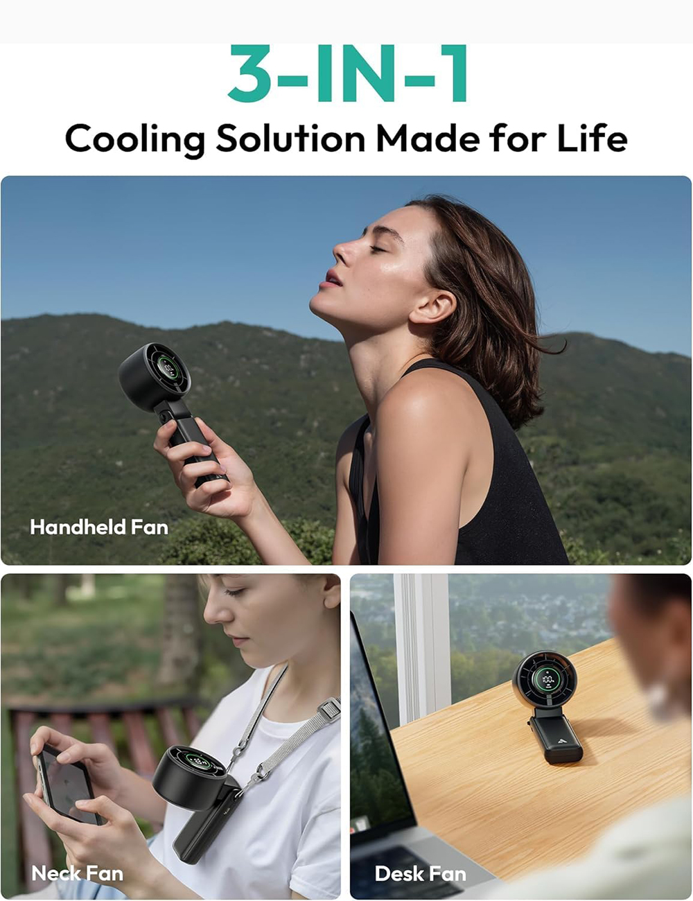 • 3-in-1 Lifestyle: Aecooly Portable Halo Fan is designed for versatility—use it handheld, on a desktop, or hands-free with the neck strap. It effortlessly fits into your routine, whether you’re commuting, working, or enjoying the outdoors