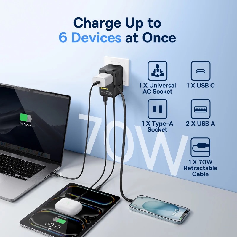 Baseus EnerCore CG11 70W Universal Travel Adapter Fast Charging Multi Plug Worldwide Charger