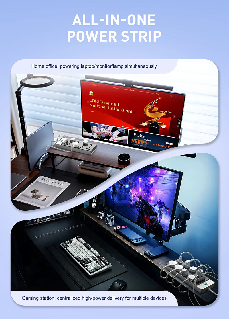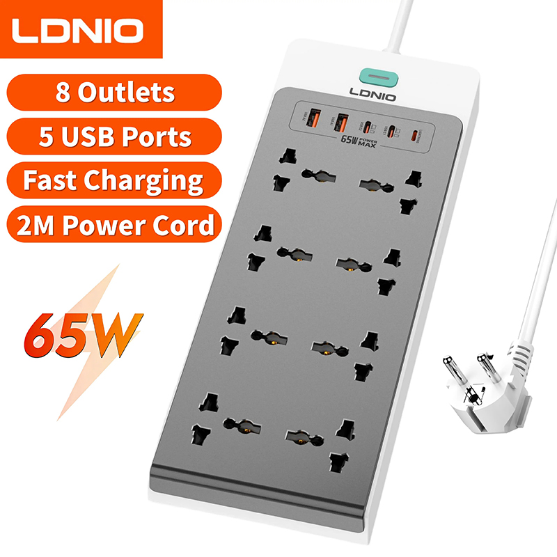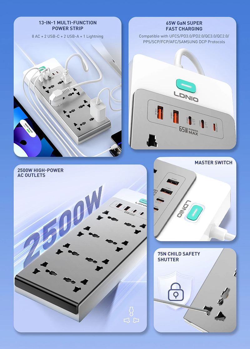 LDNIO SC4 65W PD GaN Power Strip 13-in-1 2500W 8 AC Outlets 5 USB C USB-A Extension Cord