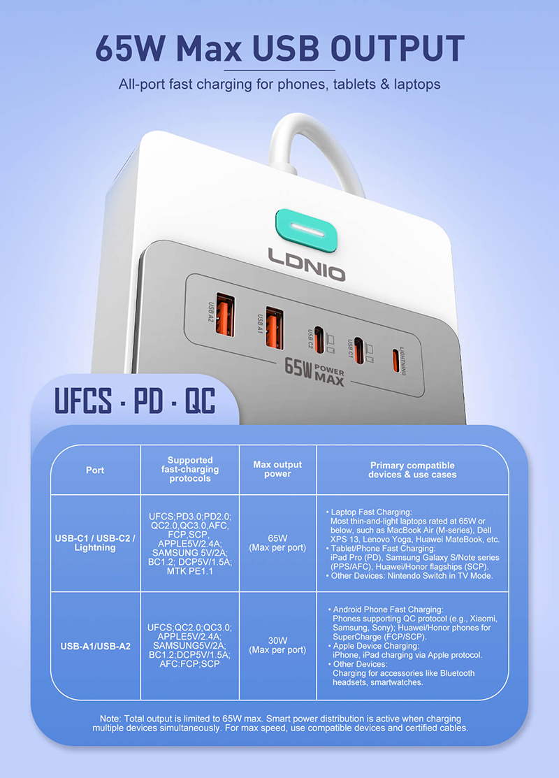 - 65W PD GaN Fast Charging: Supports UFCS PD3.0 PPS QC3.0 and multiple protocols for laptops phones and tablets.