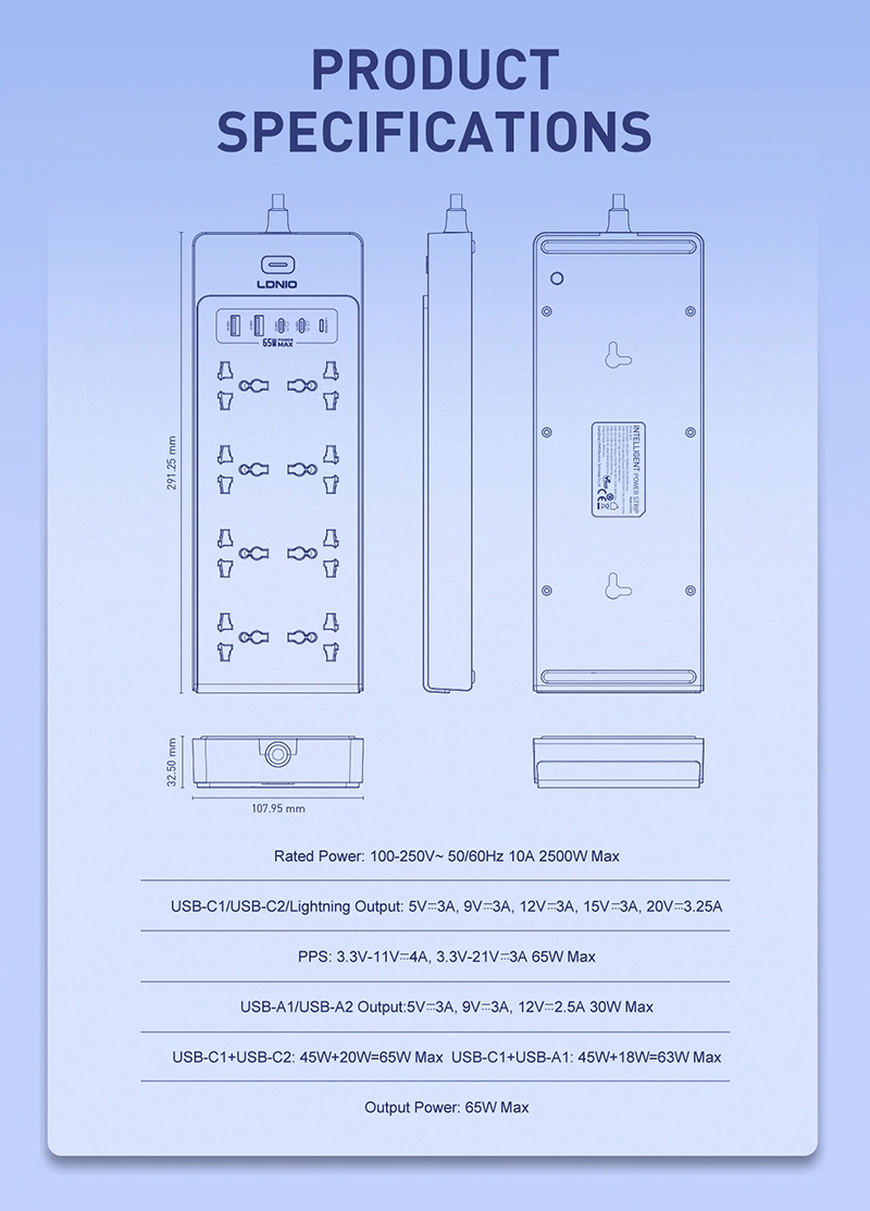 - Rated Power: 100-250V~ 50/60Hz 10A 2500W Max