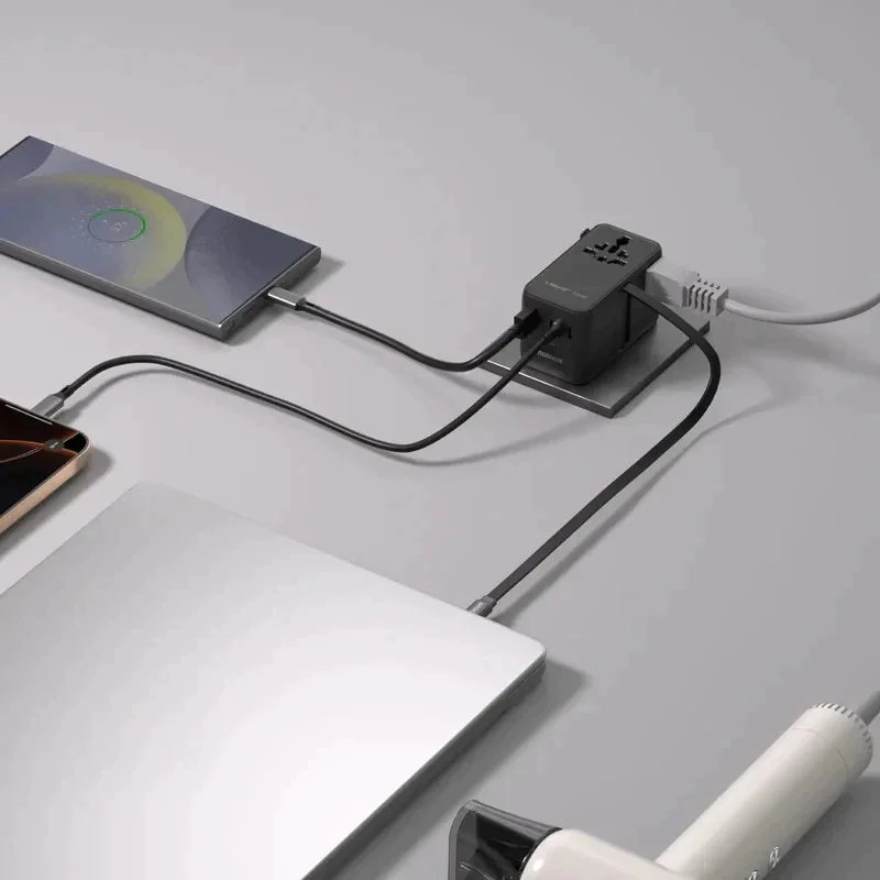 - Global Compatibility: Patented ultra-compact design with dual AC outlets and integrated GaN technology, compatible with over 200 countries and regions. Three-stage switch for easy adaptation to different plug standards worldwide.