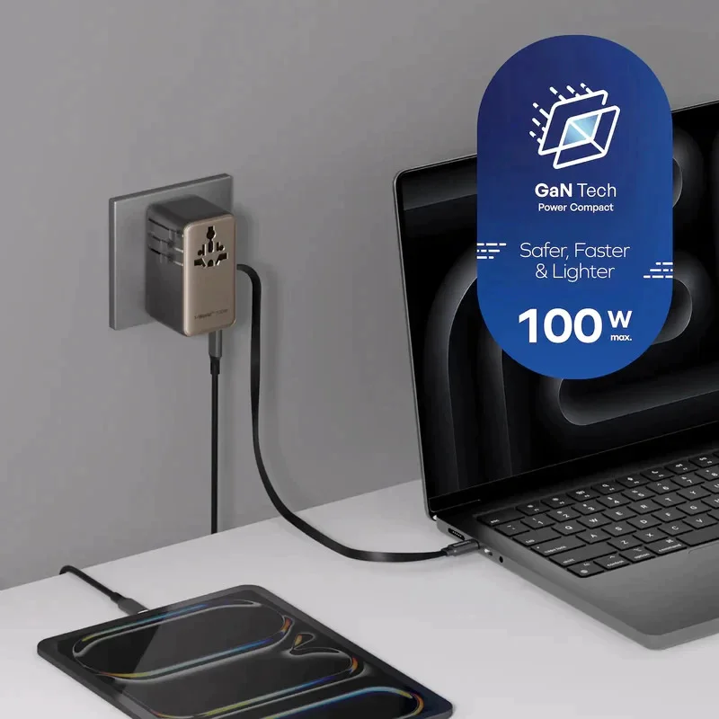 Momax UA25 1-World2+ 100W 4-Port Dual AC Travel Adapter – Powerful 100W fast-charging travel adapter with 4 USB ports, dual AC outlets, GaN technology, universal plug support for 150+ countries, smart protection, and compact design—ideal for international travel and multi-device charging.